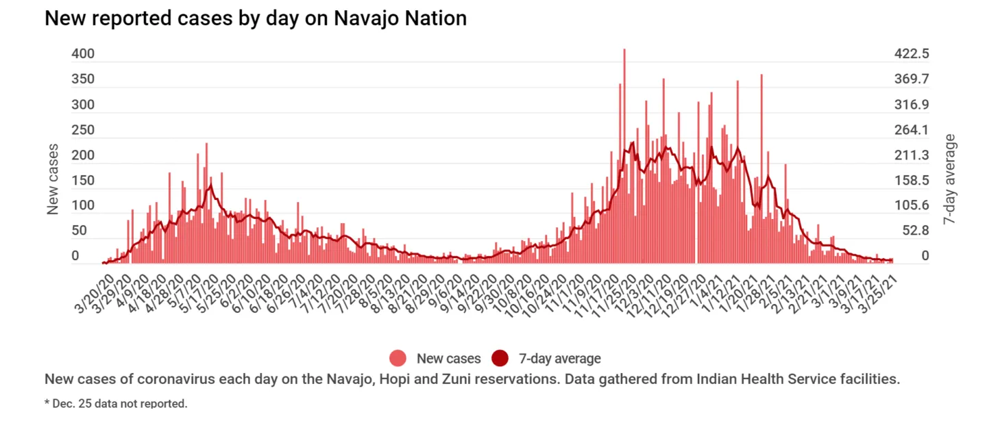 - The Navajo Nation on Monday, March 22 reported zero new coronavirus cases or deaths in the previous 24 hours for the first time in 2021.
